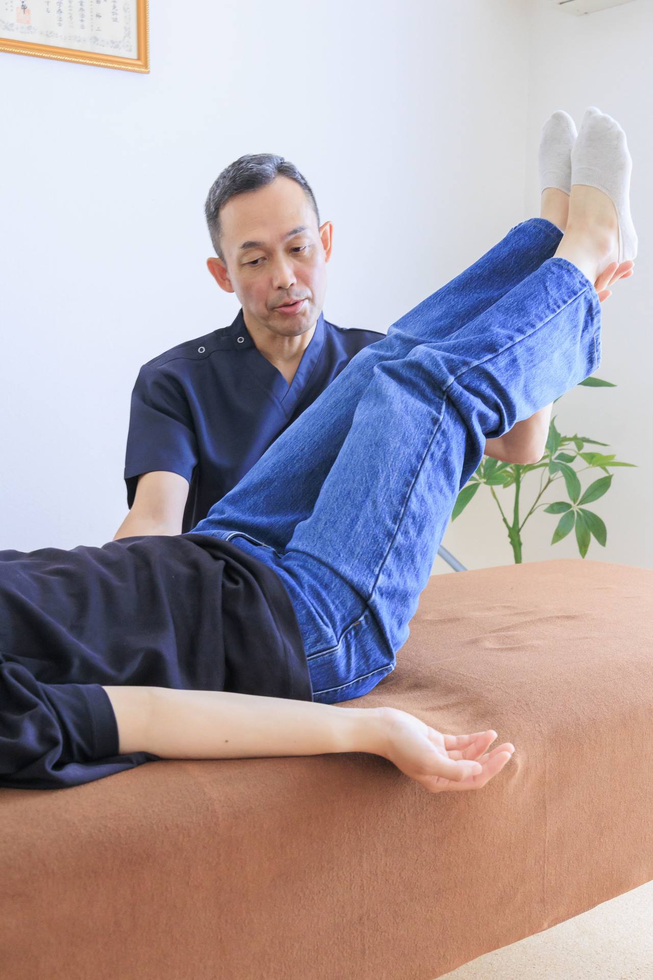 まずはベッドに横たわって、一つの狙った筋肉に正確に力が入るように患者様にどこに力が入っているかを確認しながら進めていきます。