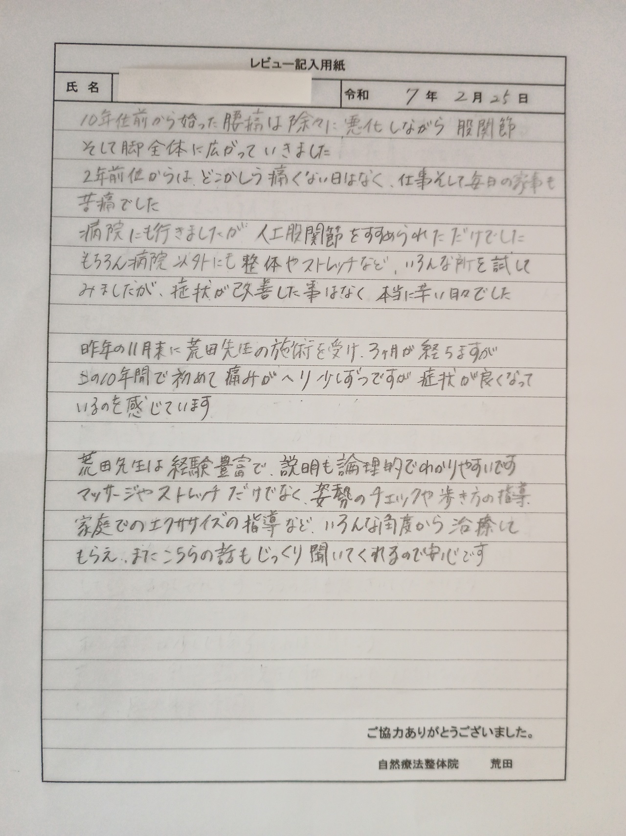 日によって右膝が痛いときと、左足がしびれることがあり続いていましたが、こちらでお世話になってからは痛かったことを忘れることがあり、杖に頼っていたのが今では杖なしでしっかりと、外を以前より速く歩けるようになりました。
